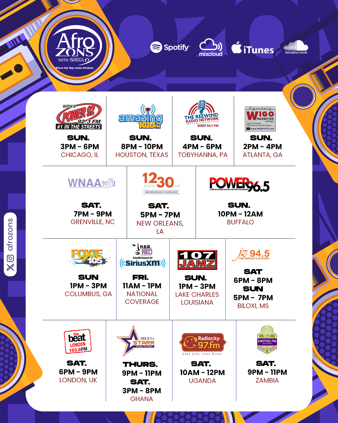 The show is hosted by Media Mogul Sheila O, a member of the Grammy academy and curator for the Afrozons Pre-Grammy Nominations Celebration in association with Black Music Collective. Afrozons music and energy targets the prime 18-34 demo, though attracting 18–65-year old’s. Afrozons is the first place to hear Afrobeat songs for the Afrobeats lover. Curating a well-balanced inclusive sound of the trending hits in urban music and afrobeats. Afrozons has culture-connected and culture-adjacent personalities as contributing experts. The show has a Podcast and is also televised in over 44 countries in Africa.